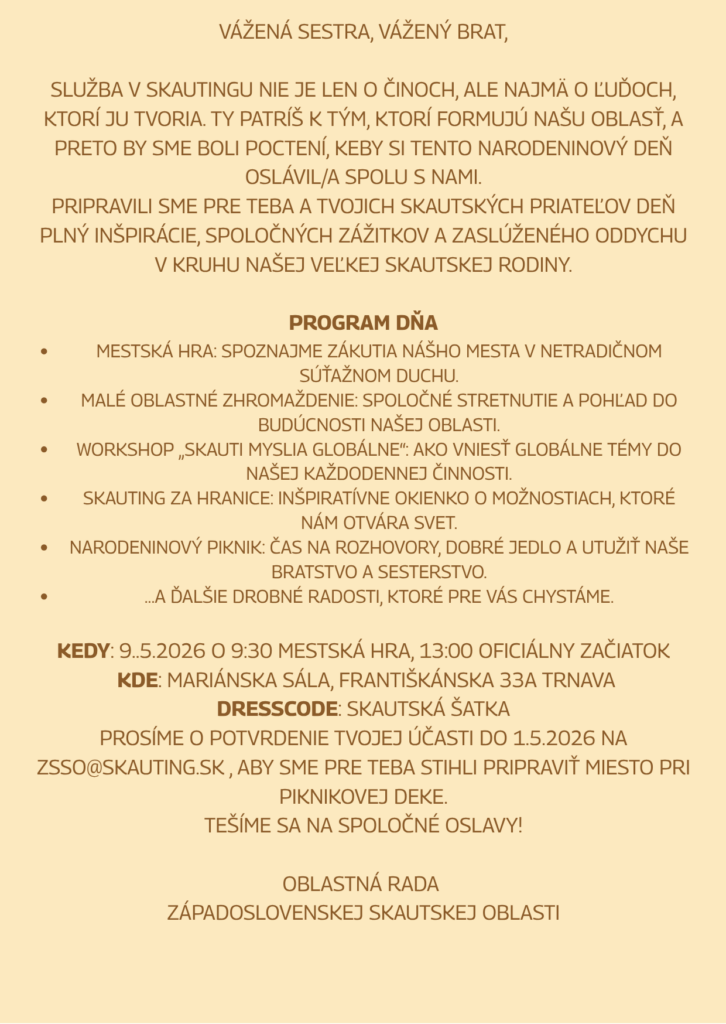 Malé oblastné zhromaždenie Je čas osláviť 10.te narodeniny ZSSO! 7. apríla 2026 7. apríla 2026 Je čas osláviť 10.te narodeniny ZSSO! Čakajú nás ďalšie radcovské skúšky 18. Apríla 2026 – kROK